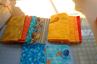 The Nemo fabric was purchased on ebay and came pre-cut. I am also using fat quarter sets from Joann's Fabric store. I spent some time at my sister/sister-in-law's house recently working on this quilt in their beautiful quilt/painting studio.